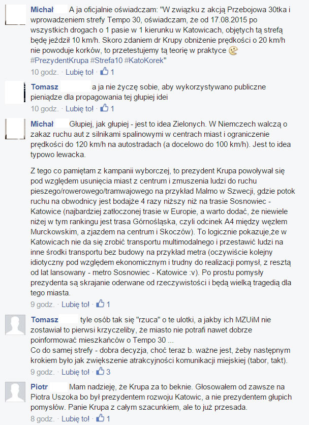 Jeden z użytkowników odniósł się też do kosztów wprowadzenia „Tempo 30”. – 150 tys czyli wystarczy wypisac 300 mandatow po 500 pln albo 500 mandatow po 300 pln i sie zwroci:) od 19 do 6 rano mysle ze w miesiac moze dwa sie zwroci a reszta na premie dla magistratu za cudowny pomysl;) brawo Urzędnicy brawo Prezydent (DOKTOR TRANSPORTU ale niestety szynowego) – pisze Piotr (pisownia oryginalna). Pojawiły się również pozytywne komentarze odnośnie idei wprowadzenia ograniczenia prędkości. Jednak nie było ich zbyt wiele.