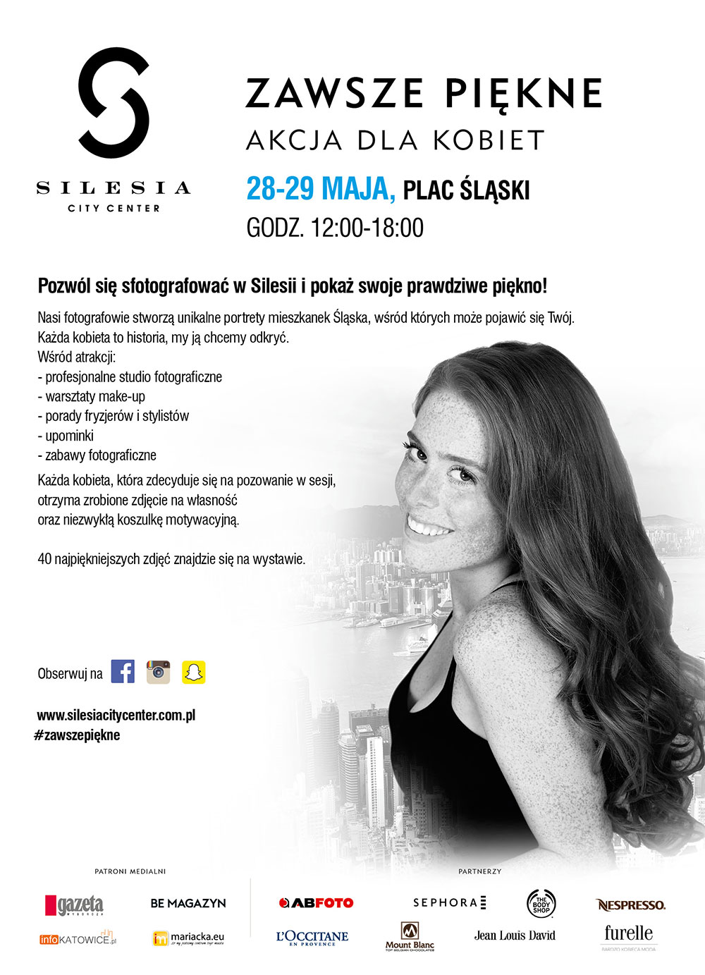 Na czym dokładnie polega akcja? W dniach 28 i 29 maja Plac Śląski zamieni się w profesjonalne studio sesyjne, gdzie powstaną unikalne, czarno-białe zdjęcia kobiet. Ostateczne efekty „poszukiwania piękna” przez Silesię, czyli 40 najpiękniejszych portretów kobiet, zostanie pokazanych podczas wystawy, która stanie w Silesii 6-15 czerwca 2016r.