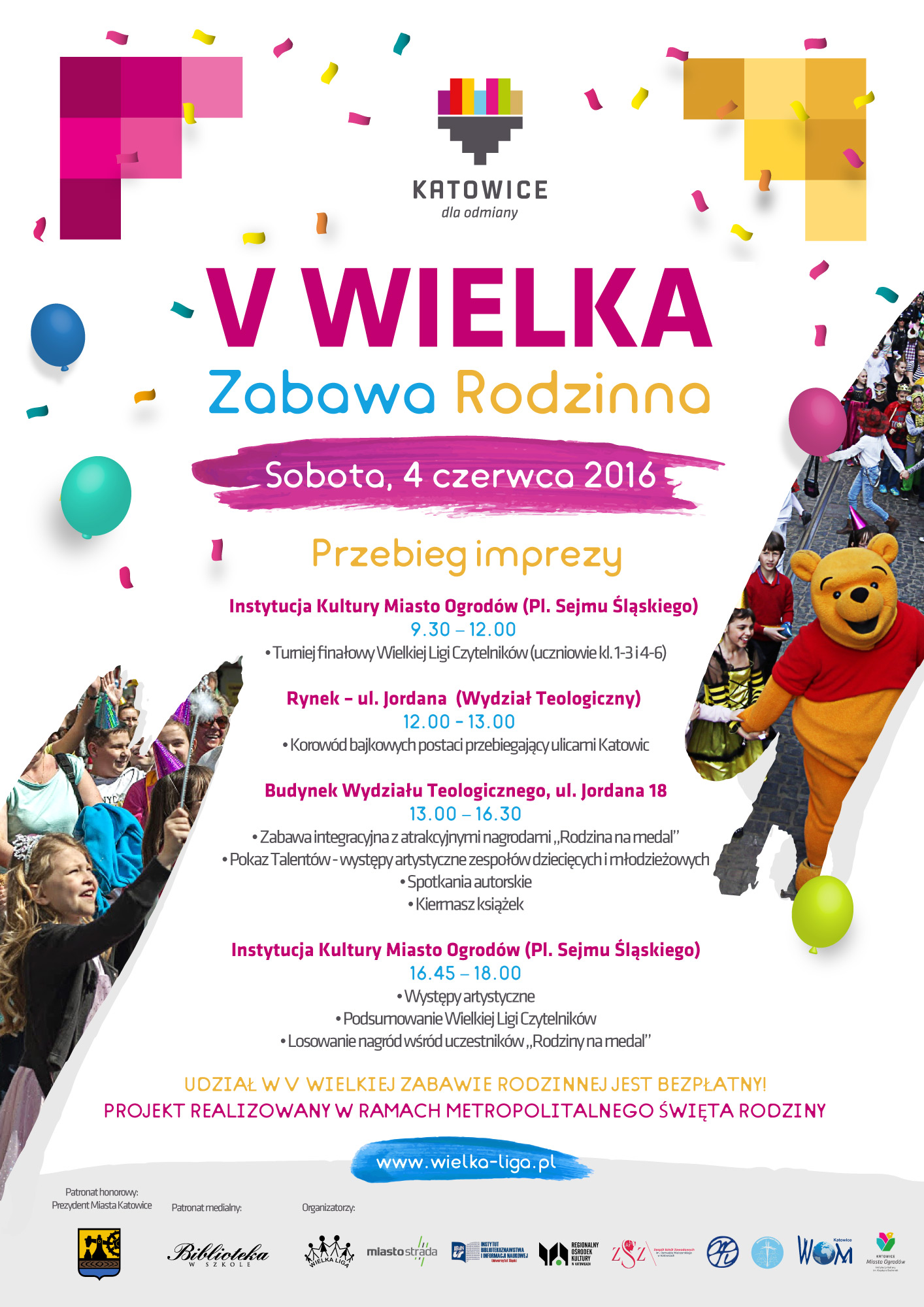 Początkiem V Wielkiej Zabawy Rodzinnej będzie korowód bajkowych postaci, który wystartuje o godzinie 12:00 z katowickiego Rynku i przejdzie do gmachu Wydziału Teologicznego Uniwersytetu Śląskiego przy ul. Henryka Jordana.