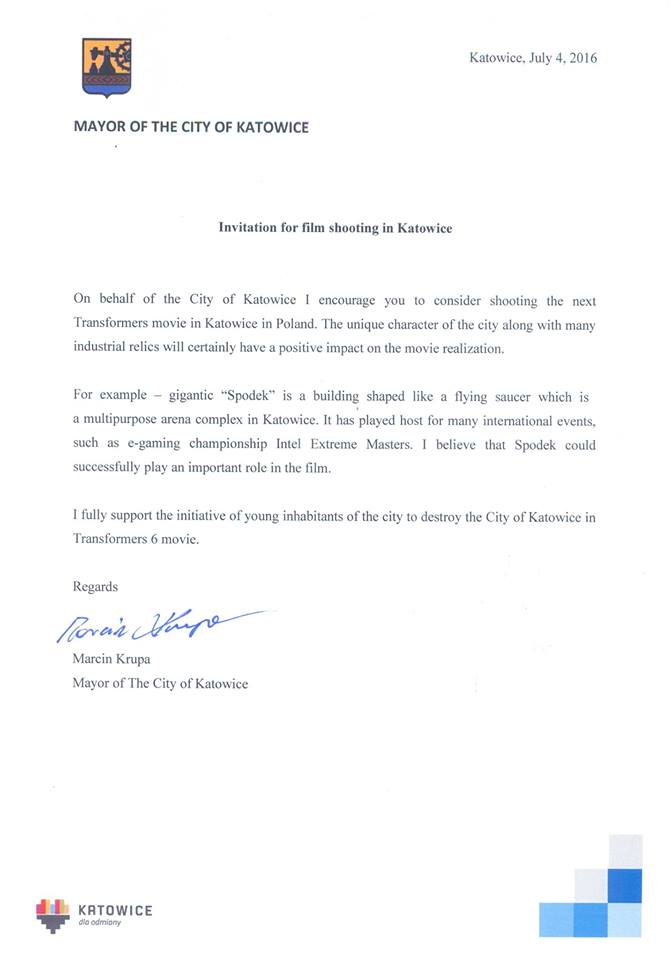 – Ja jestem bardzo wdzięczny mediom, że ten temat podchwyciły i oczywiście jakiś efekt promocyjne jest – mówi nam prezydent Katowic. – Nie zależało mi na efekcie promocyjnym w postaci podpisania przeze mnie zaproszenia do twórców tego filmu ale bardziej mi chodziło o to, aby w przyszłości jeżeli byłoby rzeczywiście, zaciekawienie naszym miastem i możliwością realizacji którejś z części Transformersów w Katowicach no to, to jest dopiero promocja na skalę globalną – dodał Krupa.