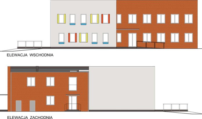 […] Układ funkcjonalny przewiduje dwa oddziały żłobka w grupach 30 osobowych. Główne wejście zlokalizowane jest od strony istniejącego Przedszkola, zaprojektowano także dwa dodatkowe wejścia, dla dostaw kuchni oraz wyjście ewakuacyjne z klatki schodowej. Szatnia z szafkami odzieży wierzchniej dla dzieci oraz wózkownia zlokalizowana przy głównym wejściu na parterze. Projektuje się 2 sale dydaktyczne jedną na parterze oraz jedną na piętrze, w każdej oddzielny węzeł sanitarny, z podziałem na bawialnię i sypialnię. Przy każdej sali znajduje się również pomieszczenie magazynowe. Sale dostępne z ogólnodostępnego korytarza. Na parterze przewiduje się kuchnię główna oraz kuchnię podręczną zawierającą rozdzielnię i zmywalnię. Zaplecze kuchenne dostępne odrębnym wejściem. Komunikacja wewnątrz budynku odbywa się poprzez główny hol na parterze oraz pierwszym piętrze skąd jest bezpośredni dostęp do sal zabawowych . Kondygnacje połączone ze sobą zostały klatką schodową oraz windą osobową. Z holu głównego korytarz prowadzi do części technicznej budynku gdzie znajduję się zaplecze kuchenne wraz z magazynami oraz administracja. Na piętrze znajdują się również pomieszczenia intendentki, dyrektorki, pomieszczenie socjalne . Od strony podwórka znajdują się pomieszczenia dostępne od zewnątrz, takie jak: kotłownia gazowa, schowek na sprzęty do zabaw Budynek jest dostosowany dla osób niepełnosprawnych, wejście dla niepełnosprawnych pochylnią zewnętrzną […] – czytamy w projekcie żłobka.
