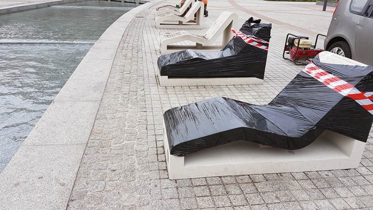 Leżaki przy sztucznej Rawie po zimie wyglądały jakby sporo przeszły. Ich urok prysł, ale na szczęście są na gwarancji.