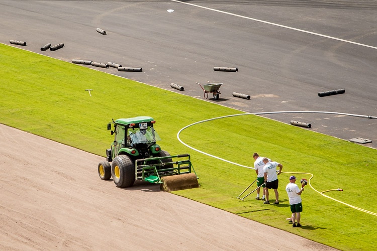 Na Stadionie Śląskim rozpoczęło się układanie murawy, cały proces potrwa do końca tygodnia. Następnie montowana będzie bieżnia lekkoatletyczna. Murawa przyjechała na Stadion z Węgier, gdzie została wybrana na plantacji pod Budapesztem. W sumie dostarczyło ją dwanaście ciężarówek, a w każdej mieści się siedemset metrów kwadratowych murawy o wadze dwudziestu czterech ton.