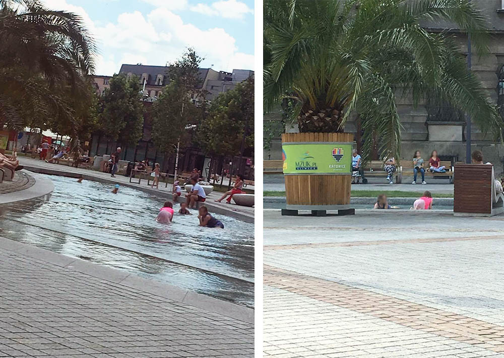 W Katowicach trzy baseny czekają na mieszkańców: W środę otrzymaliśmy od jednego z naszych użytkowników zdjęcie kąpiącej się grupki dzieci w fontannie na Rynku, dlatego namawiamy do korzystania z basenów miejskich, a nie kuszącej ozdoby przy palmach. To właśnie tam jeden z mężczyzn niedawno oddawał mocz – a tuż obok jest słynny szalet za ponad milion złotych. Atrapa rzeki przyciąga też bezdomnych, którzy się w niej myją.