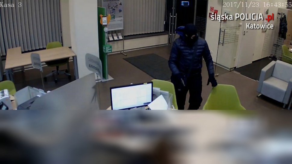 Tak wyglądał napad na bank w Katowicach. W czwartek doszło do napadu na placówkę bankową w Katowicach. Sprawca ukradł pieniądze, nagrały go kamery monitoringu.