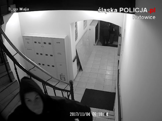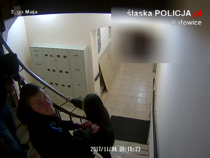 Zuchwała kradzież w centrum Katowic. Katowicka policja publikuje nagranie z kamer monitoringu, na których widać sprawców kradzieży. Mężczyźni weszli do klatki schodowej za swoją ofiarą, wszystko nagrały kamery monitoringu.