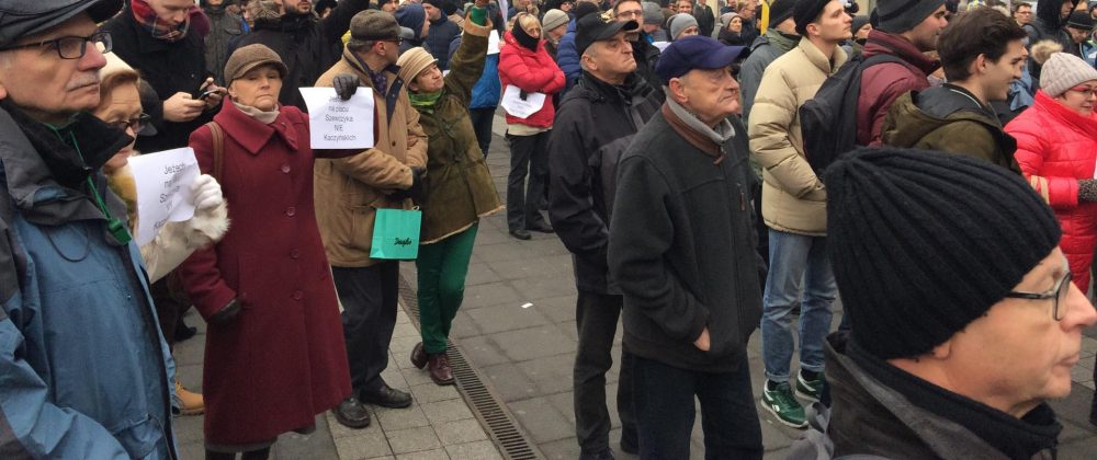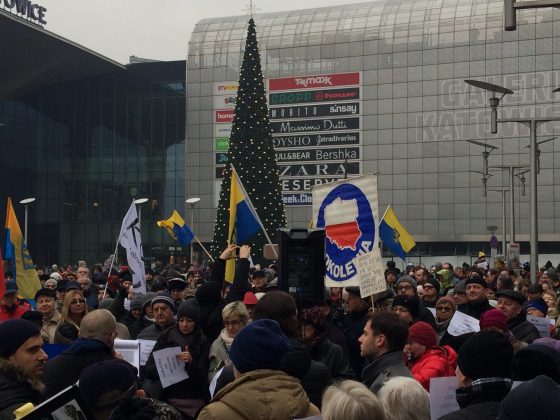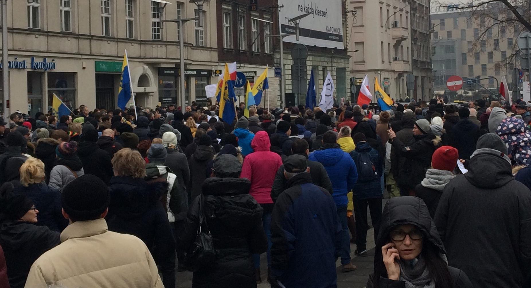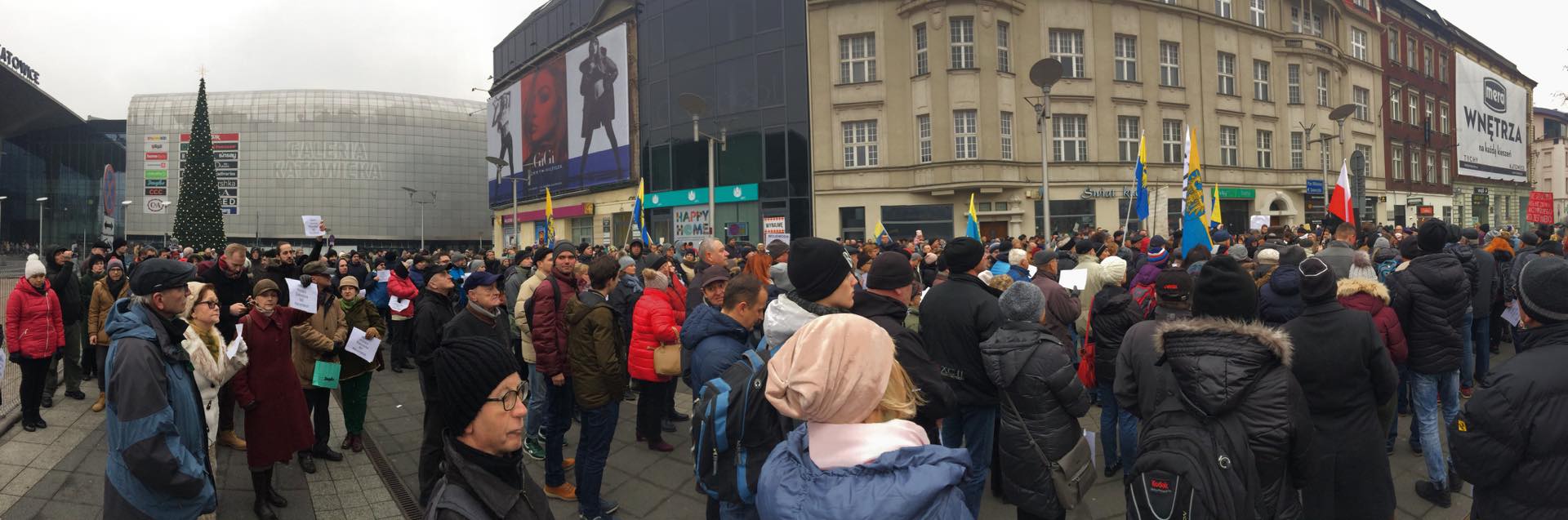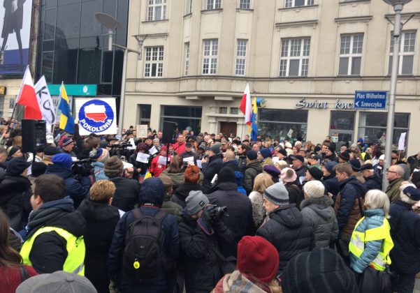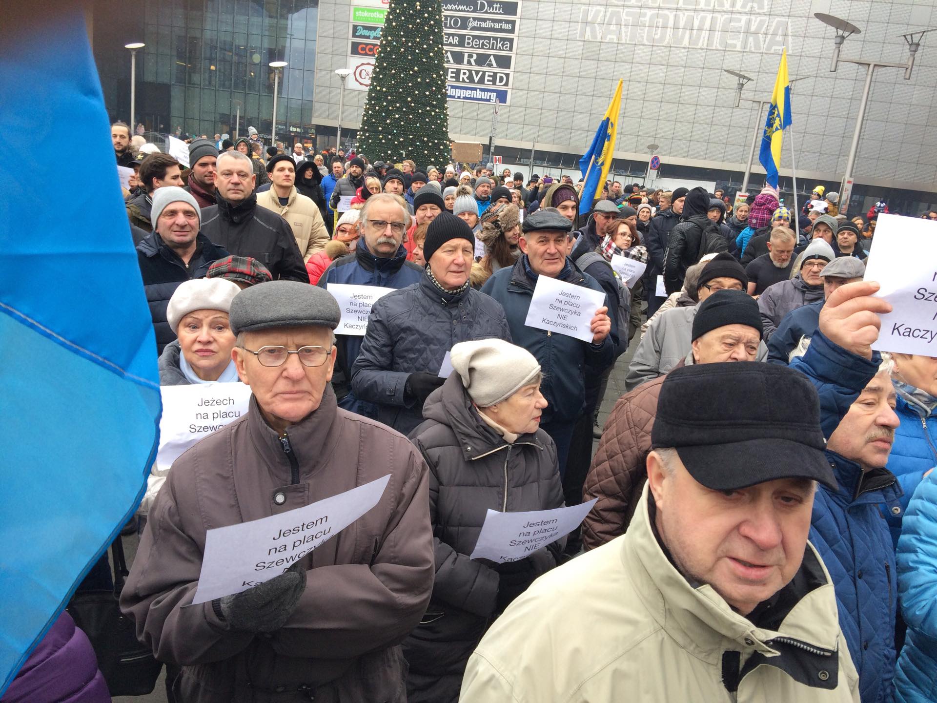Pokaźny tłum mieszkańców zebrał się na placu Szewczyka w Katowicach. To protest przeciwko decyzji wojewody śląskiego, który zmienił nazwę placu Szewczyka na plac imienia Marii i Lecha Kaczyńskich.