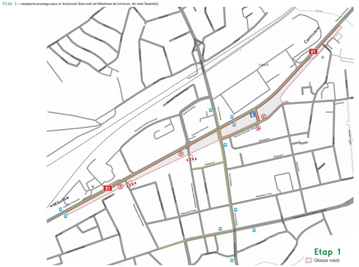 – Wraz z pracami W związku z prowadzonymi pracami wprowadzony zostanie zakaz wjazdu z ul. Kościuszki w ul. Sobocińskiego i ul. Małachowskiego. Dojazd do tych ulic zostanie poprowadzony ul. Armii Krajowej i ul. Jankego. Dojazd do ul. Harcerzy Września 1939 będzie utrzymany w śladzie istniejącego łącznika, natomiast będzie na nim wprowadzony ruch jednokierunkowy – wyjazd z ul Harcerzy Września 1939 roku poprowadzony zatem będzie do ul. Armii Krajowej – informują urzędnicy.