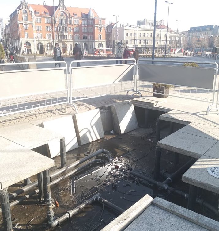 Obecnie teren wygląda jakby były tam prowadzone poważne roboty. Uszkodzone są nie tylko płyty granitowe ale wewnętrzne instalacje – rury, dysze.