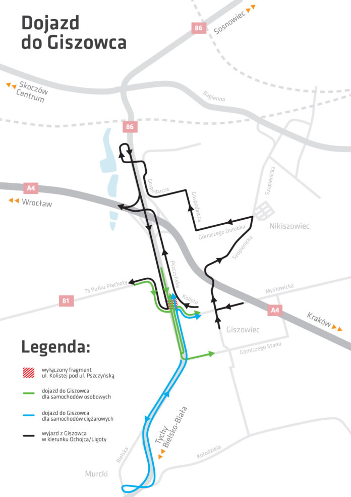 - Dojazd do Giszowca dla samochodów ciężarowych – jadąc ul. Pszczyńską od centrum Katowic będziemy kierowani w stronę Murcek, gdzie nawracanie będzie możliwe będzie na węźle drogowym z ul. Kołodzieja, by wrócić ul. Pszczyńską zjazdu na ul. Kolistą.