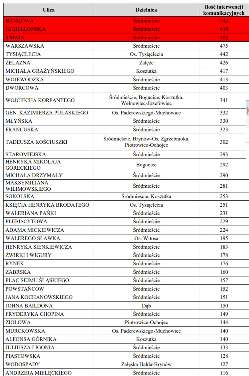 Najwięcej interwencji odnotowano w na ulicy Bankowej 745, Jagiellońskiej 610 i 3 Maja 488. Poniżej pełna lista.
