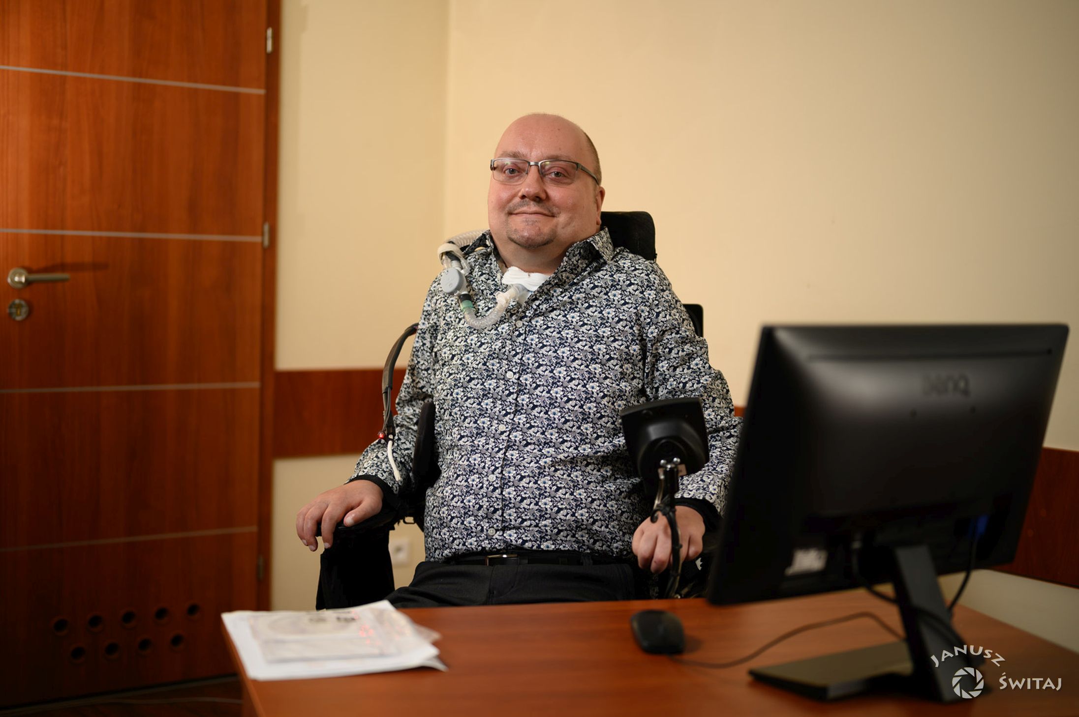 Dzisiejszy gość w wieku 18 lat w wypadku komunikacyjnym doznał zmiażdżenia rdzenia i złamał kręgosłup szyjny na wysokości C2-C3. W wyniku doznanego urazu stracił własny oddech oraz możliwość wykonywania samodzielnie, kontrolowanego przez mózg ruchu we wszystkich kończynach. Pan Janusz od lat porusza się na wózku inwalidzkim oraz oddycha za pomocą respiratora.