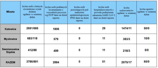 W woj. śląskim odnotowano kolejne zgony. Zmarli: w szpitalu w Rybniku zmarli: 82-letni mężczyzna z Gliwic i 79-letnia kobieta z powiatu rybnickiego; w szpitalu w Tychach 76-letni mężczyzna z Gliwic; w szpitalu w Sosnowcu zmarli: 83-letni mężczyzna z Sosnowca, 73-letnia kobieta z Sosnowca i 56-letni mężczyzna z powiatu będzińskiego; w szpitalu w Zawierciu zmarli: 76-letni mężczyzna z powiatu zawierciańskiego, 47-letnia kobieta z powiatu będzińskiego, 61-letni mężczyzna z powiatu będzińskiego i 76-letni mężczyzna z powiatu zawierciańskiego; w szpitalu w Cieszynie zmarli: 75-letni mężczyzna z powiatu cieszyńskiego i 73-letnia kobieta z powiatu cieszyńskiego; w szpitalu w Raciborzu zmarli: 81-letnia kobieta z Rybnika, 73-letni mężczyzna z Jastrzębia-Zdroju i 84-letni mężczyzna z powiatu myszkowskiego; w szpitalu w Tychach 82-letni mężczyzna z Żor; w szpitalu w Częstochowie zmarli: 86-letnia kobieta z powiatu lublinieckiego, 79-letni mężczyzna z Częstochowy, 66-letnia kobieta z powiatu częstochowskiego, 66-letni mężczyzna z Częstochowy, 84-letnia kobieta z powiatu częstochowskiego, 81-letni mężczyzna z Częstochowy i 72-letnia kobieta z powiatu częstochowskiego; w szpitalu w Katowicach zmarli: 69-letni mężczyzna z powiatu wodzisławskiego i 90-letnia kobieta z Chorzowa; w szpitalu w Wodzisławiu Śląskim 51-letni mężczyzna z powiatu wodzisławskiego; w szpitalu w Bytomiu zmarli: 76-letnia kobieta z Bytomia, 67-letni mężczyzna z powiatu tarnogórskiego i 69-letni mężczyzna z Bytomia; w szpitalu w Chorzowie zmarli: 88-letni mężczyzna z powiatu tarnogórskiego i 69-letnia kobieta z Chorzowa; 85-letnia kobieta z Chorzowa; w szpitalu w Dąbrowie Górniczej zmarli: 88-letnia kobieta z Dąbrowy Górnicze i 72-letni mężczyzna z powiatu zawierciańskiego; w szpitalu w Blachowni zmarli z powiatu częstochowskiego: 89-letnia kobieta, 68-letni mężczyzna, 83-letnia kobieta, 64-letnia kobieta i 79-letnia kobieta; w szpitalu w Orzeszu 67-letni mężczyzna z Chorzowa; w szpitalu w Świętochłowicach 67-letnia kobieta z Chorzowa; w szpitalu w Bielsku-Białej zmarli: 68-letni mężczyzna z Bielska-Białej, 70-letni mężczyzna z powiatu bielskiego, 70-letni mężczyzna z Bielska-Białej, 60-letni mężczyzna z powiatu bielskiego, 68-letnia kobieta z Bielska-Białej i 69-letnia kobieta z Bielska-Białej a w szpitalu w Pszczynie 80-letnia kobieta z powiatu bielskiego.