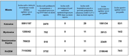 W Katowicach odnotowano 197 nowych zakażeń na COVID-19. Niestety, 1 osoba zmarła, to 86-letni mieszkaniec Katowic. (w całym kraju odnotowano 275 zgonów). Obecnie w kwarantannie znajduje się 2470 mieszkańców.