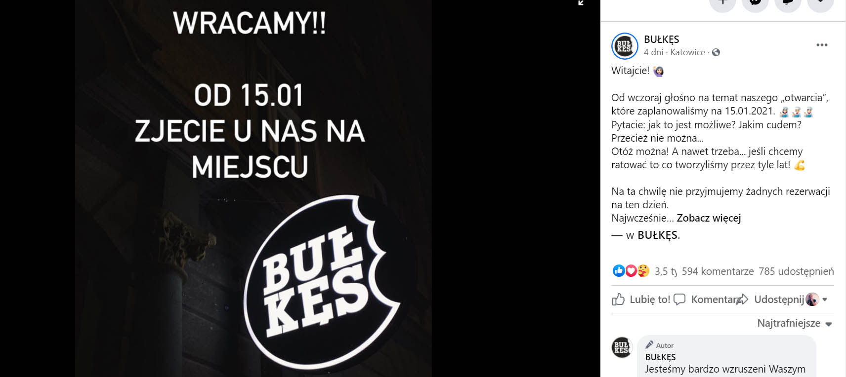 Katowicka restauracja zamierza się otworzyć. Poinformowała o tym w mediach społecznościowych. „Bułkęs” zamierza otworzyć się z dniem 15 stycznia i serwować jedzenie na miejscu pomimo obowiązujących zakazów.