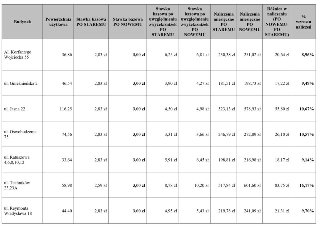 Wprowadzenie nowych stawek w praktyce oznacza wzrost miesięcznych opłat średnio od kilku do kilkunastu procent. Przykładowe symulacje dla lokali w Katowicach.