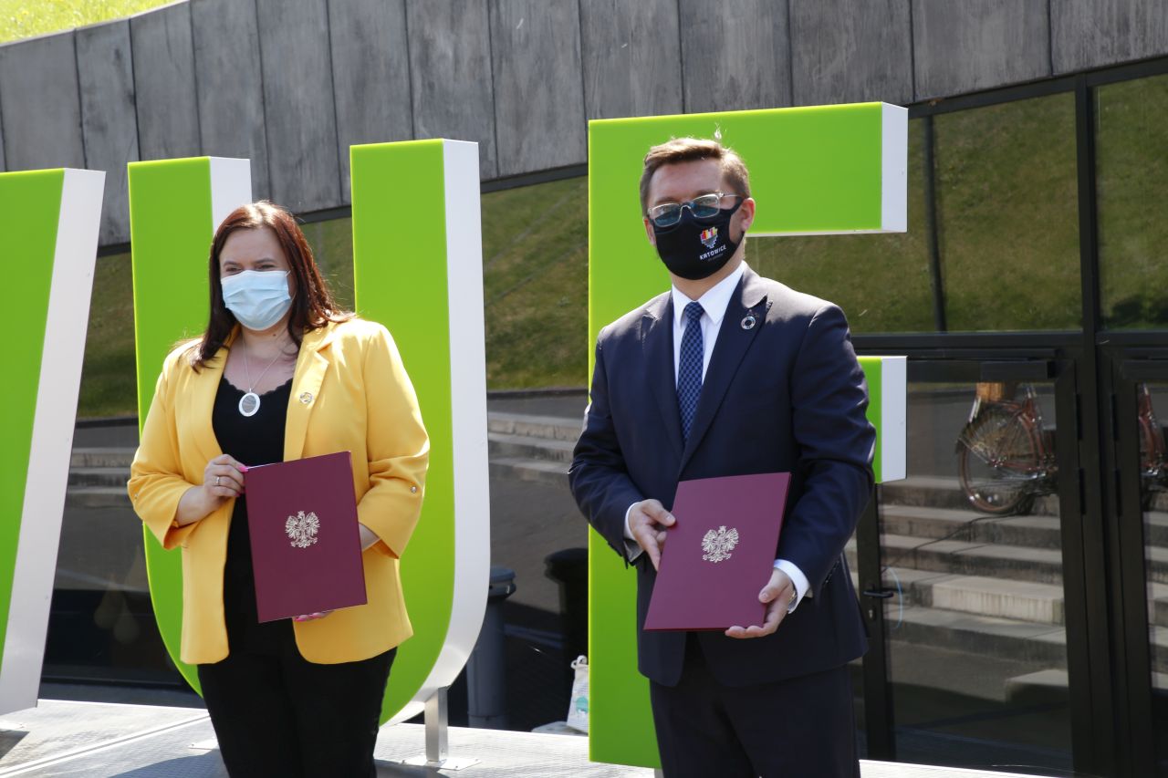 Wiceminister Małgorzata Jarosińska-Jedynak i prezydent Marcin Krupa podpisali podczas konferencji porozumienie w sprawie organizacji Światowego Forum Miejskiego w czerwcu 2022 r.