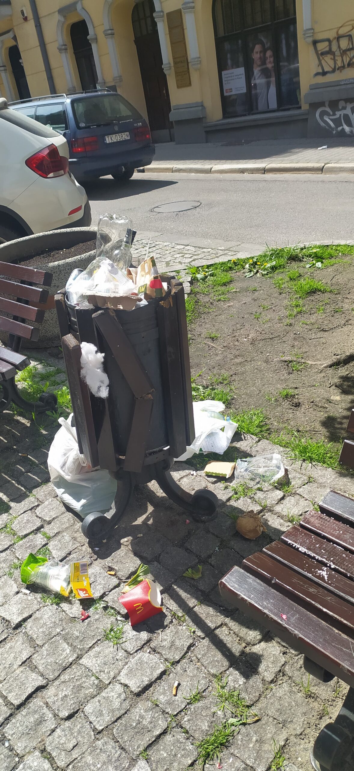 Dzisiaj ciągle można zobaczyć wysypujące się odpady z koszy na śmieci w Katowicach zarówno w centrum jak i np. w Parku Kościuszki.