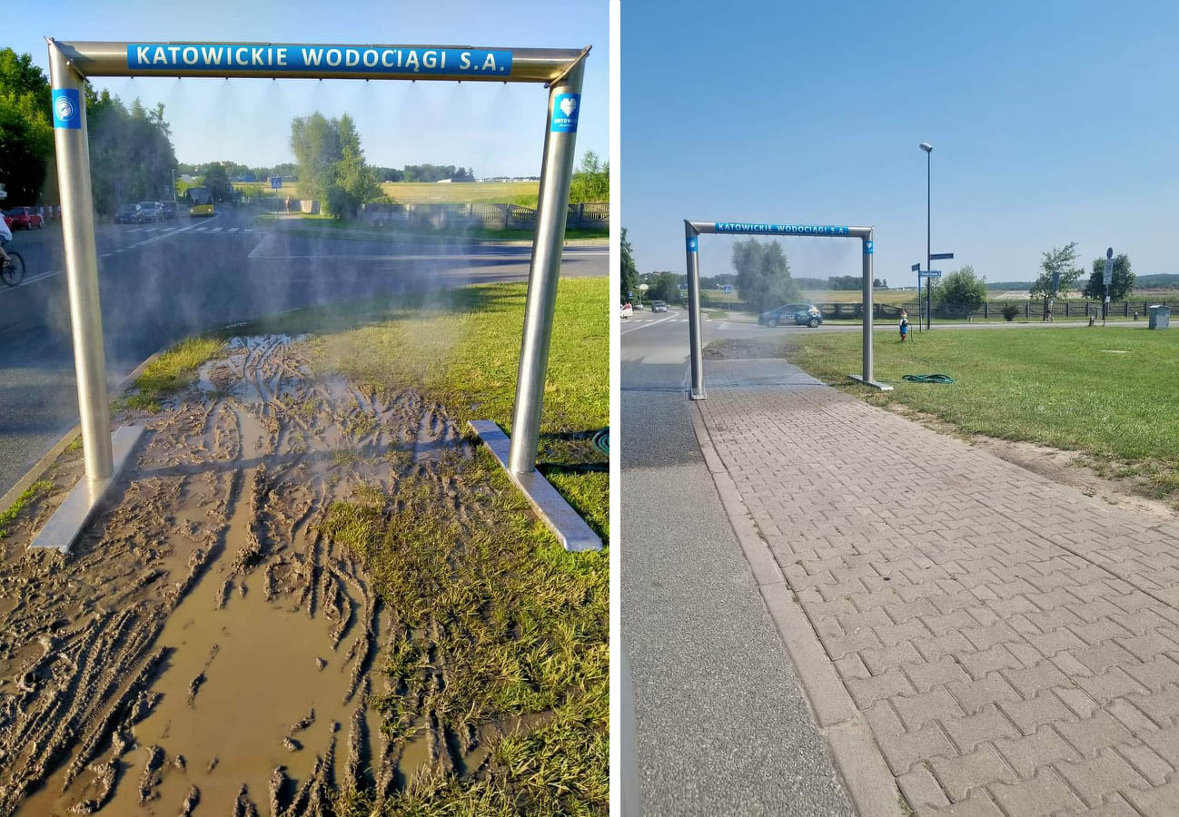 Kurtyna wodna została ustawiona na trawie w Muchowcu, pod nią zaczęło się tworzyć błoto od ciągle lejącej się wody. Skutek był taki, że nikt z niej nie mógł skorzystać. To zbulwersowało część mieszkańców. Zdjęcia przesłali właśnie Markowi Matyszczakowi, który wytyka urzędnikom problemy w przestrzeni miasta. Po informacji w tej sprawie na Facebooku Katowickie Wodociągi ostatecznie przestawiły kurtynę.