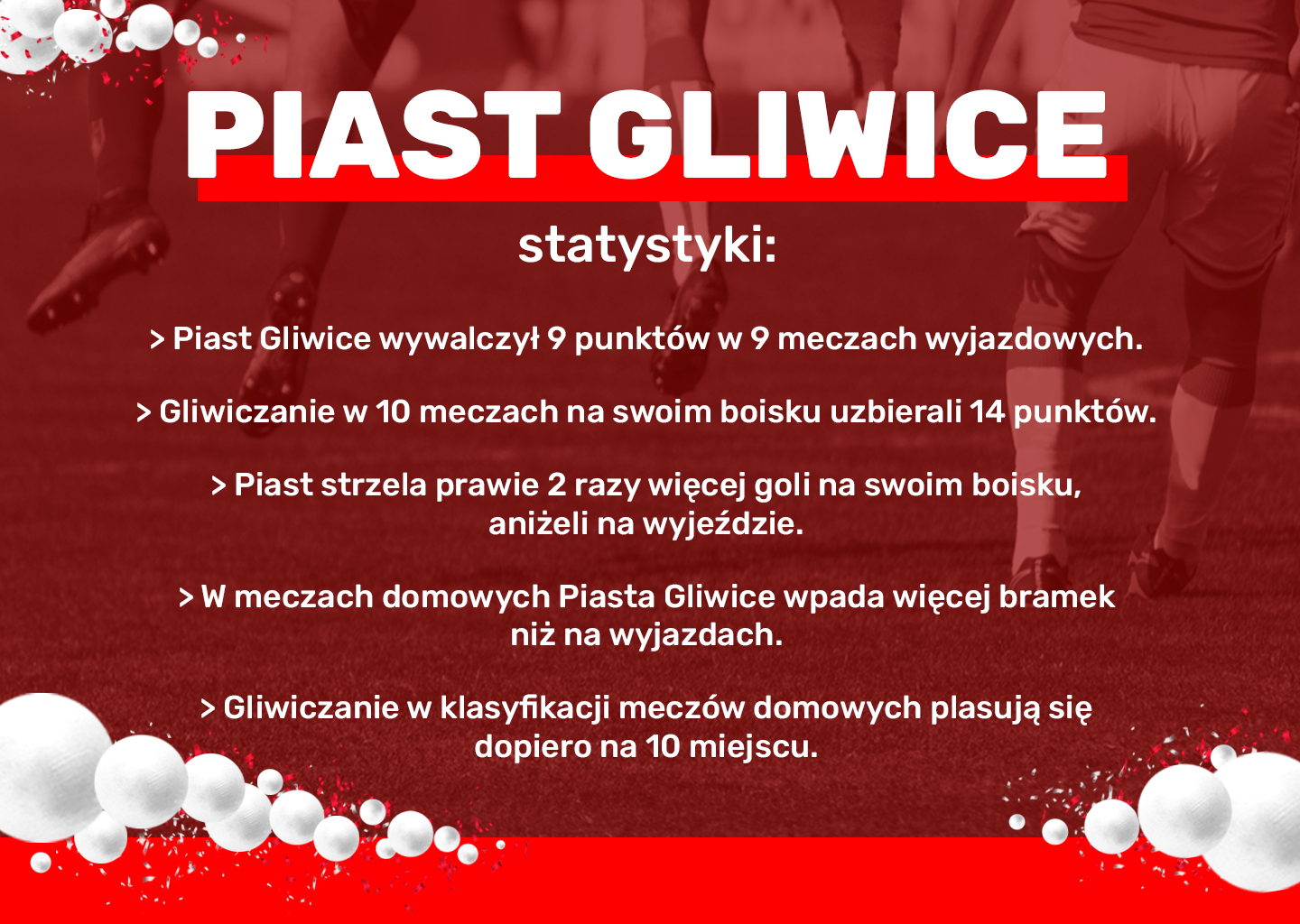 Podopieczni Waldemara Fornalika przed startem sezonu zakładali walkę o europejskie puchary. Po rundzie jesiennej można jednak napisać, że sytuacja Piasta mocno się skomplikowała. Gliwiczanie mają na koncie zaledwie 23 punkty wywalczone na boiskach Ekstraklasy, co oznacza, że bliżej im do strefy spadkowej aniżeli do czołówki tabeli. Na ten moment do czwartego w tabeli Radomiaka, Piast traci 12 punktów.