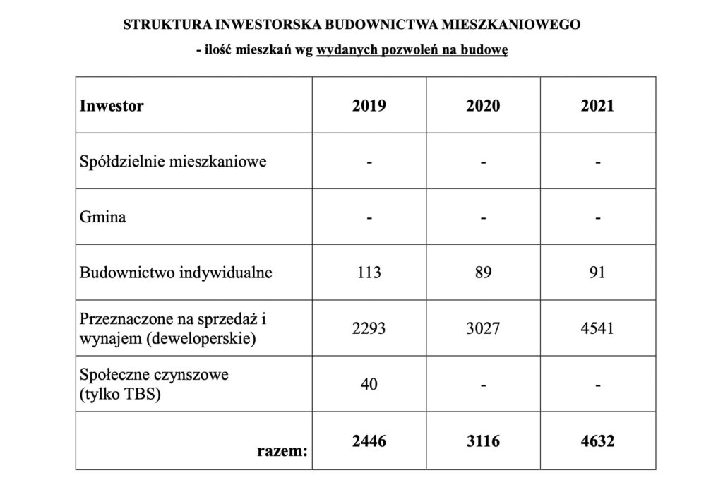 W 2019 roku w mieście wydano 2446 pozwoleń na budowę z czego 2293 to inwestycje deweloperskie – przeznaczone na sprzedaż lub wynajem. 40 dotyczyło KTBS a 113 budownictwa indywidualnego.