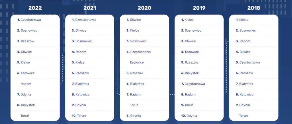 Gdańsk i Częstochowa to bezapelacyjni zwycięzcy tegorocznej edycji, nie w każdym jednak rankingu zajmowały tę samą pozycję. „Katowice w tym roku wskoczyły z miejsca 8 na 6. Miasto okazało się numerem jeden w kwestiach liczby dostępnych stacji ładowania pojazdów elektrycznych oraz dynamiki jazdy” – informują organizatorzy rankingu.
