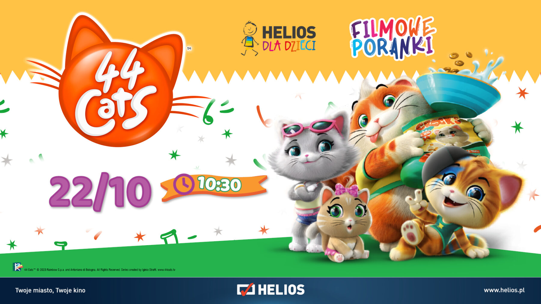 Mamy dla Was podwójne zaproszenie do Kina Helios na Filmowe Poranki: „44 Koty, cz. 2”. Wydarzenie to odbędzie się 22 października 2023 roku o godz. 10:30 w Kinie Helios, ul. Kościuszki 229 w Katowicach.