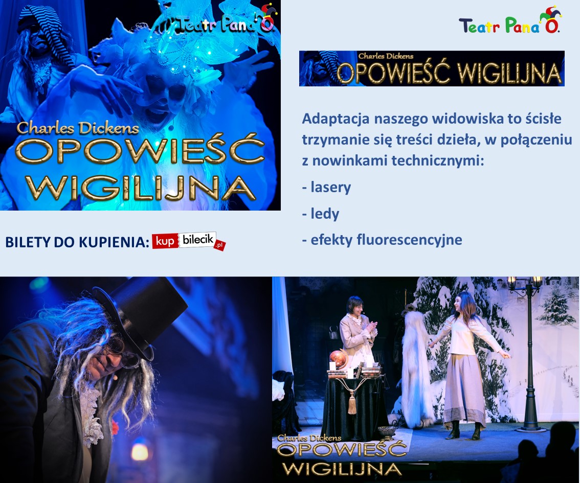 Teatr Pana O. przedstawia słynną Dickensowską opowieść o upartym skąpcu, którego w noc Bożego Narodzenia nawiedzają trzy duchy, powodując jego moralną przemianę. Nasza historia, jest ujęta dowcipnie mieszając się jednak z ironicznym nastrojem i powagą, a uczucie z wyrachowaniem. Spektakl rozegrany jest w konwencji łączącej żywy plan aktorski z wykorzystaniem kostiumów UV, dekoracji ledowych oraz efektów laserowych.