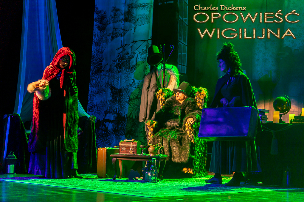 Teatr Pana O. przedstawia słynną Dickensowską opowieść o upartym skąpcu, którego w noc Bożego Narodzenia nawiedzają trzy duchy, powodując jego moralną przemianę. Nasza historia, jest ujęta dowcipnie mieszając się jednak z ironicznym nastrojem i powagą, a uczucie z wyrachowaniem. Spektakl rozegrany jest w konwencji łączącej żywy plan aktorski z wykorzystaniem kostiumów UV, dekoracji ledowych oraz efektów laserowych.