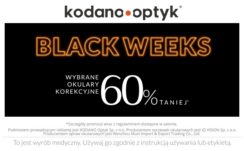 Black Weeks to czas, który przyciąga uwagę osób szukających najlepszych ofert i promocji, a propozycja od KODANO Optyk to prawdziwa perełka. Aż 60% rabatu na wybrane okulary korekcyjne to niecodzienna szansa, by zadbać o zdrowie swoich oczu w atrakcyjnej cenie, bez kompromisów w kwestii jakości i stylu. To promocja, na którą warto było czekać przez cały rok – idealny moment, by zainwestować w modny i funkcjonalny dodatek, który jednocześnie poprawi komfort widzenia. Warto skorzystać już teraz, bo taka okazja szybko się nie powtórzy!