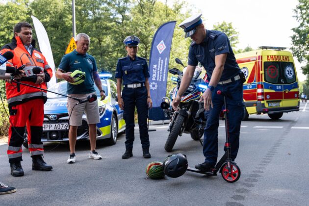 Ratownicy medyczni z WPR Katowice zaprezentowali symulację upadku osoby jadącej na hulajnodze elektrycznej. Porównano skutki uderzenia głowy w kasku i bez niego. Różnica była wyraźna – w przypadku braku zabezpieczenia ryzyko poważnych urazów głowy rośnie kilkukrotnie.